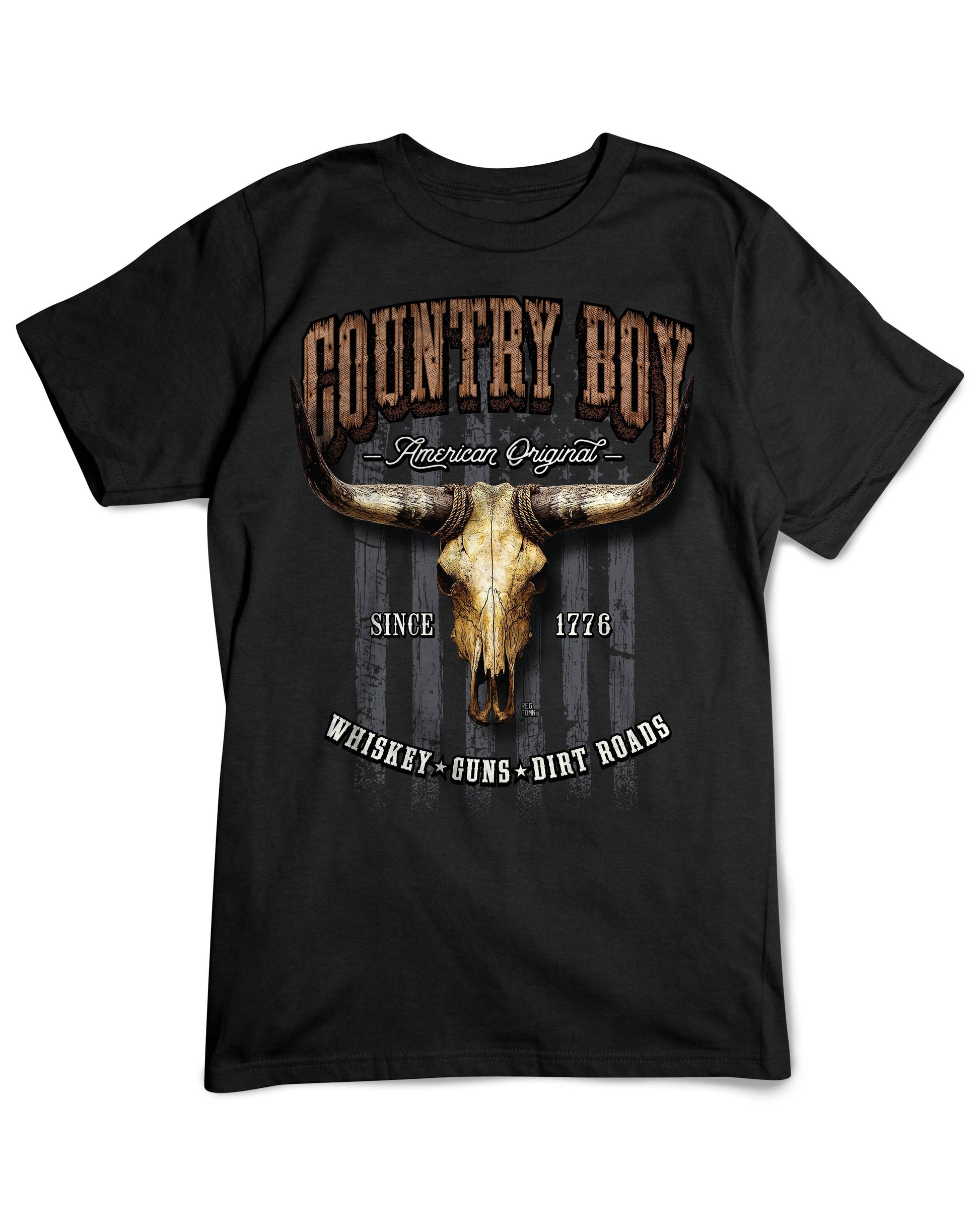 Celebrate rugged American heritage with the Country Boy American Original T-Shirt. Made from 100% cotton, this black T-shirt features a bold longhorn skull graphic over a distressed U.S. flag backdrop. The vintage Western lettering reads “Country Boy – American Original,” paired with details like Since 1776 and Whiskey • Guns • Dirt Roads for a true country lifestyle statement.
