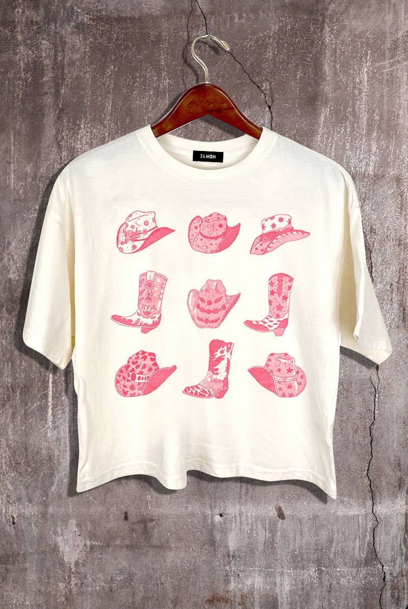 Add a touch of Western charm to your wardrobe with this cream graphic top, featuring playful pink cowboy hats and boots. Made from 100% cotton for softness and breathability, this versatile top pairs perfectly with denim, skirts, or your favorite boots. Whether you’re headed to the rodeo or just want a casual cowgirl vibe, this piece is made to stand out.