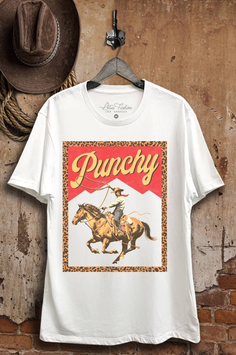 Bring the rodeo heat with this bold “Punchy” graphic tee, framed in a leopard-print border and featuring a cowboy mid-lasso. Made from 100% cotton for all-day softness and breathability, it’s perfect for wrangling style and comfort.