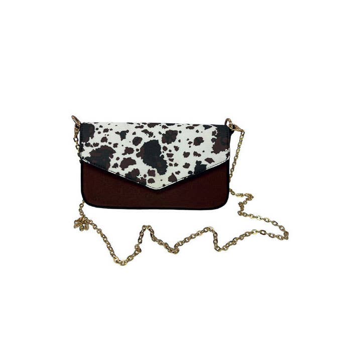 A little wild, a little classy this crossbody clutch blends cowhide print with rustic charm. With a sleek envelope flap and gold chain strap, it’s perfect for boots-and-jeans days or nights out on the ranch. Western attitude meets chic convenience in one perfect cowgirl essential.